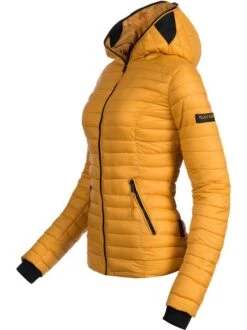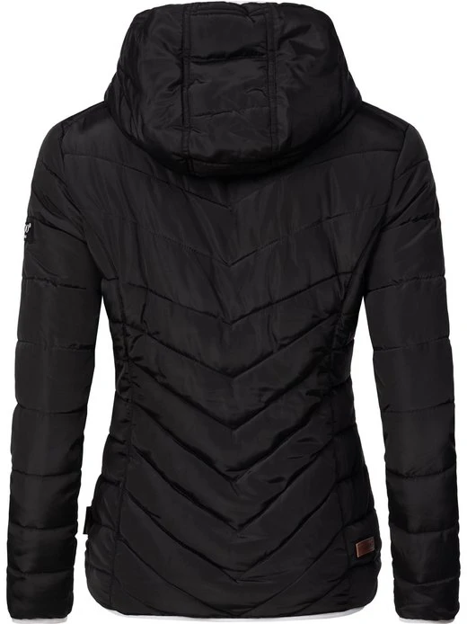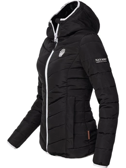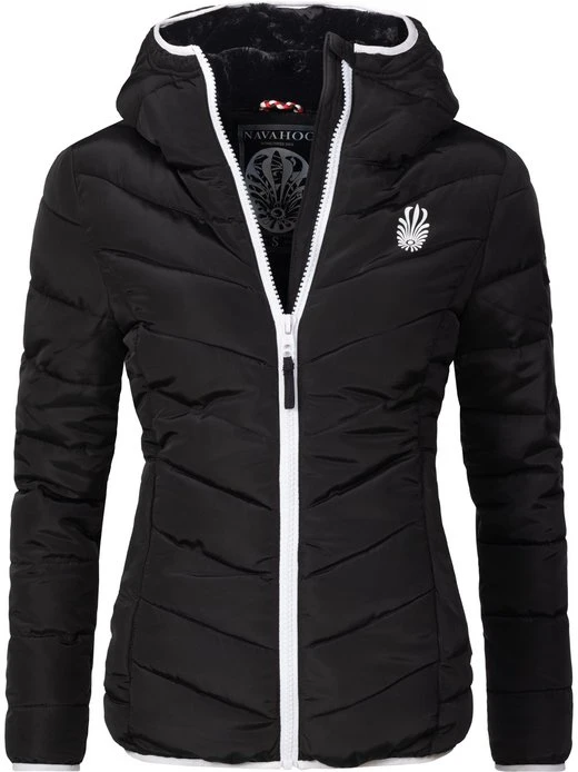 Stylisch gesteppte Damen Winterjacke mit weißen Details und großer Kapuze – perfekt für die kalte Jahreszeit.