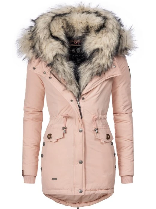 Wattierter Winterparka mit Kapuze, abnehmbaren Kunstpelz und auffälligen Details wie Kunstlederverzierungen und kontrastfarbene Druckknöpfe.